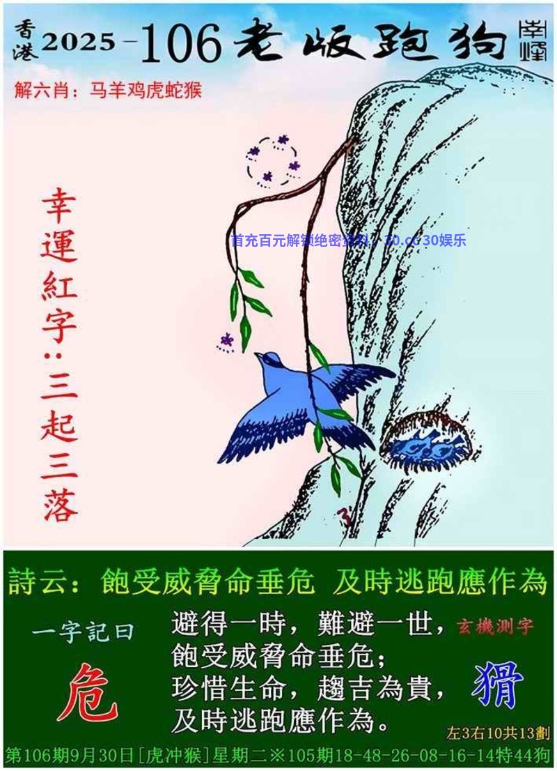 106期【独家玄机谜语】開:猪43準! ≤终南山翠色欲流,肆弦壹声如裂帛≥ 解:南解南肖牛鸡蛇,色解好色的猪,弦声解琴肖鸡蛇兔 综合取肖:牛鸡蛇猪兔马 |